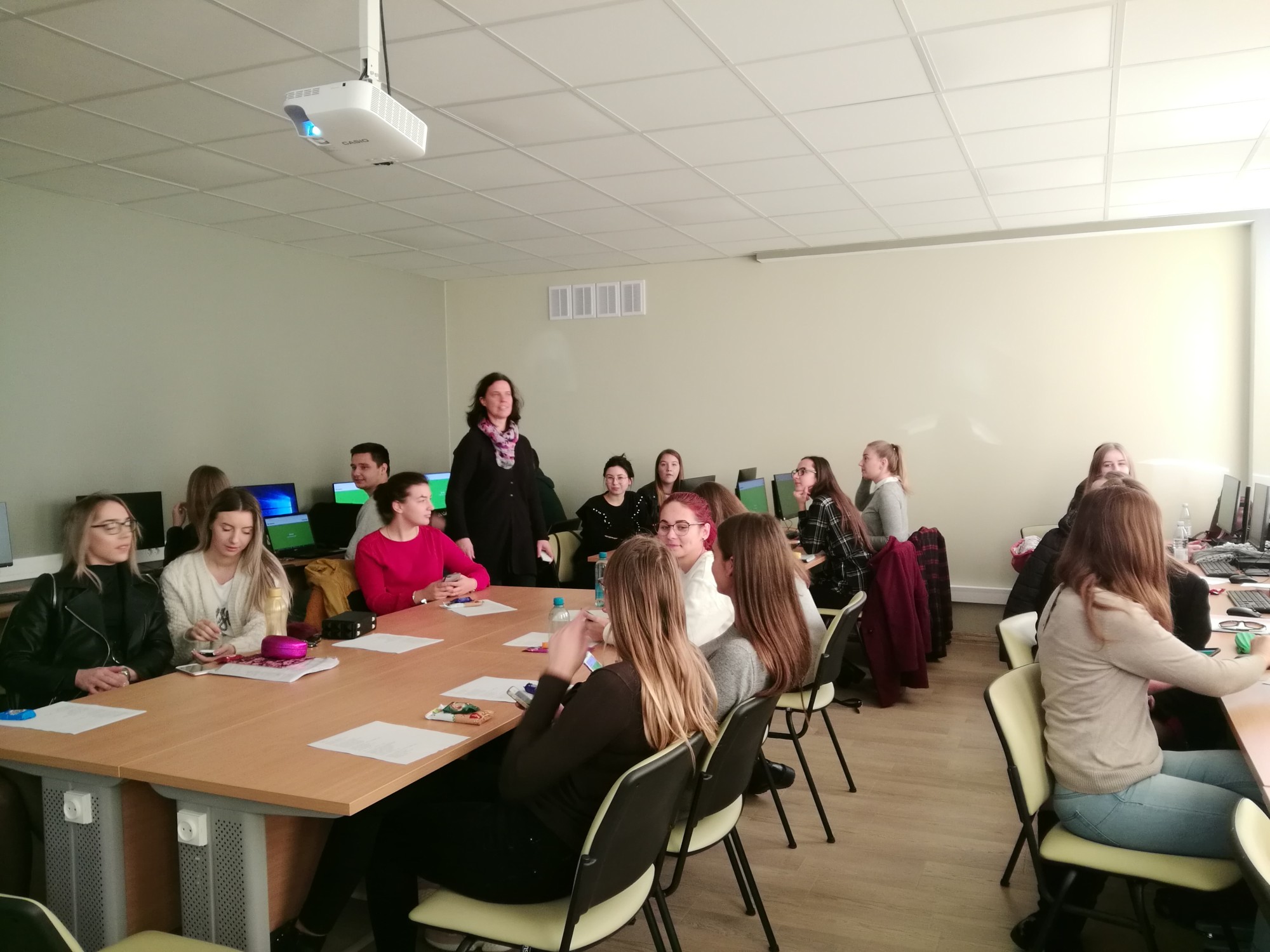 Pradžioje, kaip įprastai, visi sudainavo SKAMP sukurtą dainą „Ja, ich kann“ (https://www.youtube.com/watch?v=19dvnN8aZsg), skirtą Vokiečių kalbos dienoms, o Užsienio kalbų centro vedėja Jūratė Patackaitė papasakojo studentams apie naujai atsiradusiais galimybes, mokantiems vokiečių kalbą ir pasidžiaugė, kad darbdaviai kaip niekad aktyviai ieško mokančių ne tik anglų kalbą, bet ir pradinį lygį turinčių ar mokančių vokiečių bei skandinavų (danų, švedų, norvegų) kalbas bei paskatino studentus daugiau laiko skirti kalbų mokymuisi ne tik paskaitose, bet ir laisvalaikiu, pasinaudojus įvairiomis išmaniosiomis programomis.